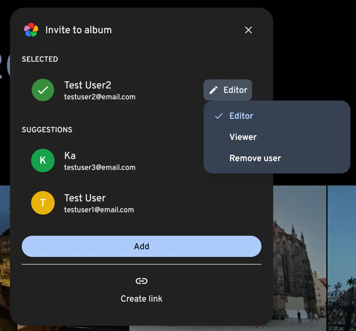 After creating an album, you can access the sharing options by clicking on the share icon. When sharing an album, you can select the users you want to share the album with and assign them permissions either as editors (read-write) or viewers (read-only).